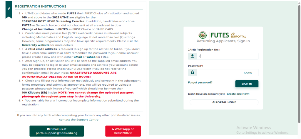 1. Log in to https://portal.futes.edu.ng/apply/