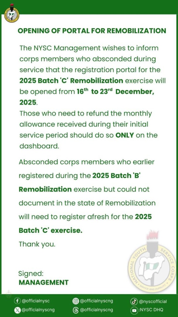 The NYSC Management wishes to inform corps members who absconded during service that the registration portal for the 2025 Batch ‘C’ Remobilization exercise will be opened from 16th to 23rd December, 2025.